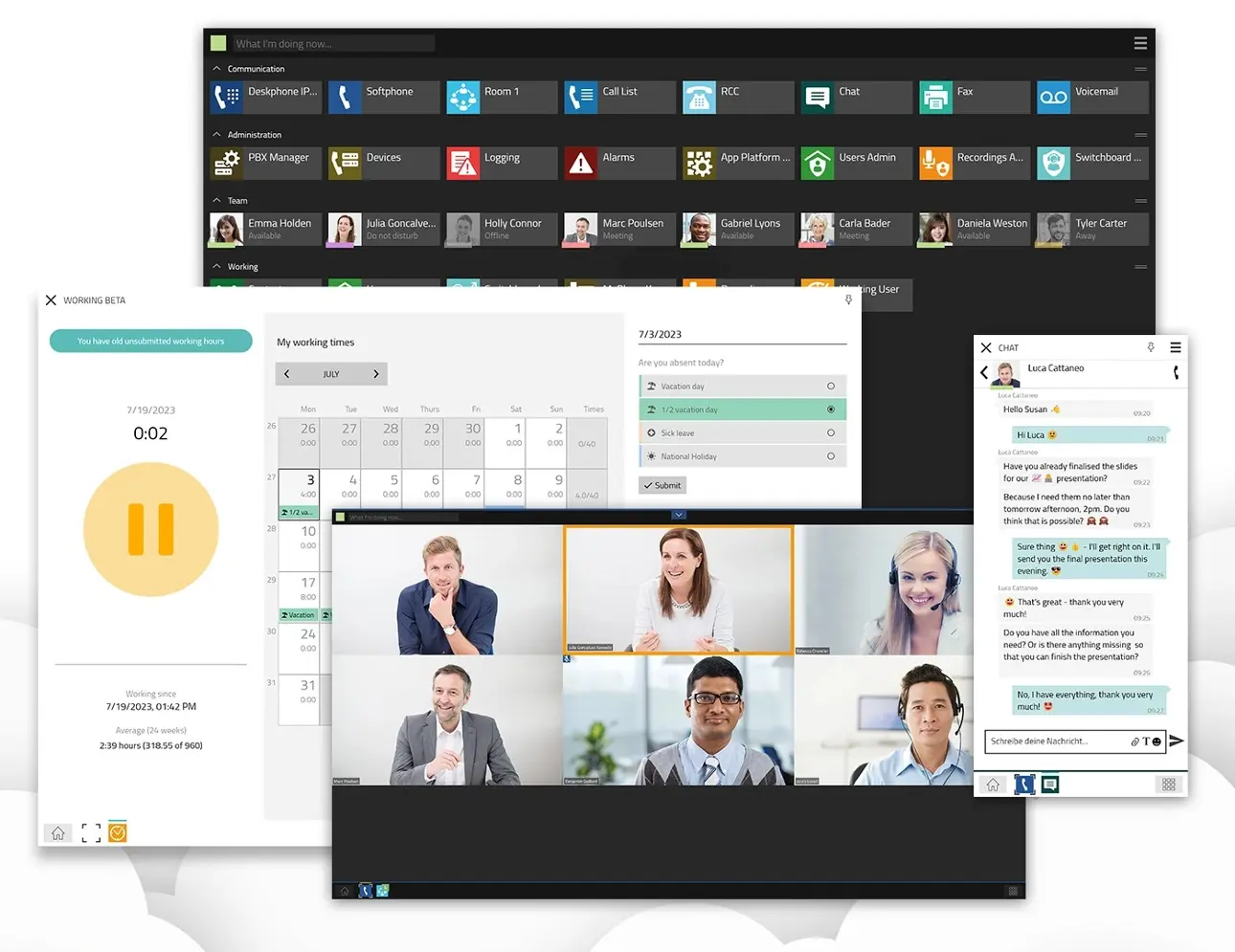 - IP-PBX corporativa incluida: centralita en la nube con todas las funcionalidades de telefonía clásica (desvíos, colas, grupos, operadora, etc.), integrada con herramientas UC y apps de productividad.